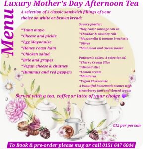 To Book afternoon tea you have to call or message us on Facebook; to book either 0151 647 6044 or email [email protected]